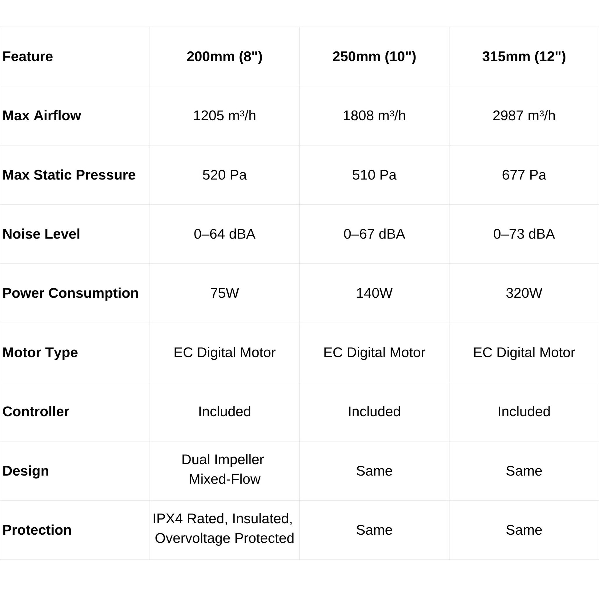 - Hãy xem Bảng thông số kỹ thuật quạt ở trên để biết thông tin chi tiết về luồng khí, công suất, mức độ tiếng ồn và nhiều thông tin khác cho từng kích thước quạt